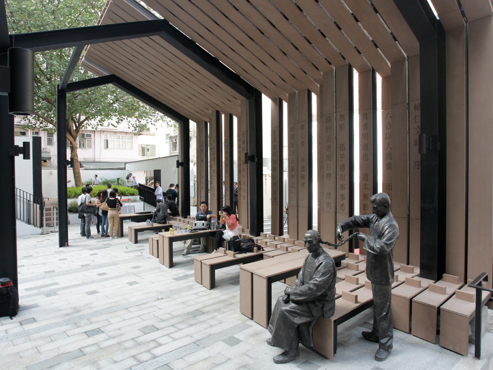 圖:百子里公園內有刻上「輔仁文社」社綱的木亭架,以及象徵革命成功的「剪辮」人型銅像 林雨燊攝