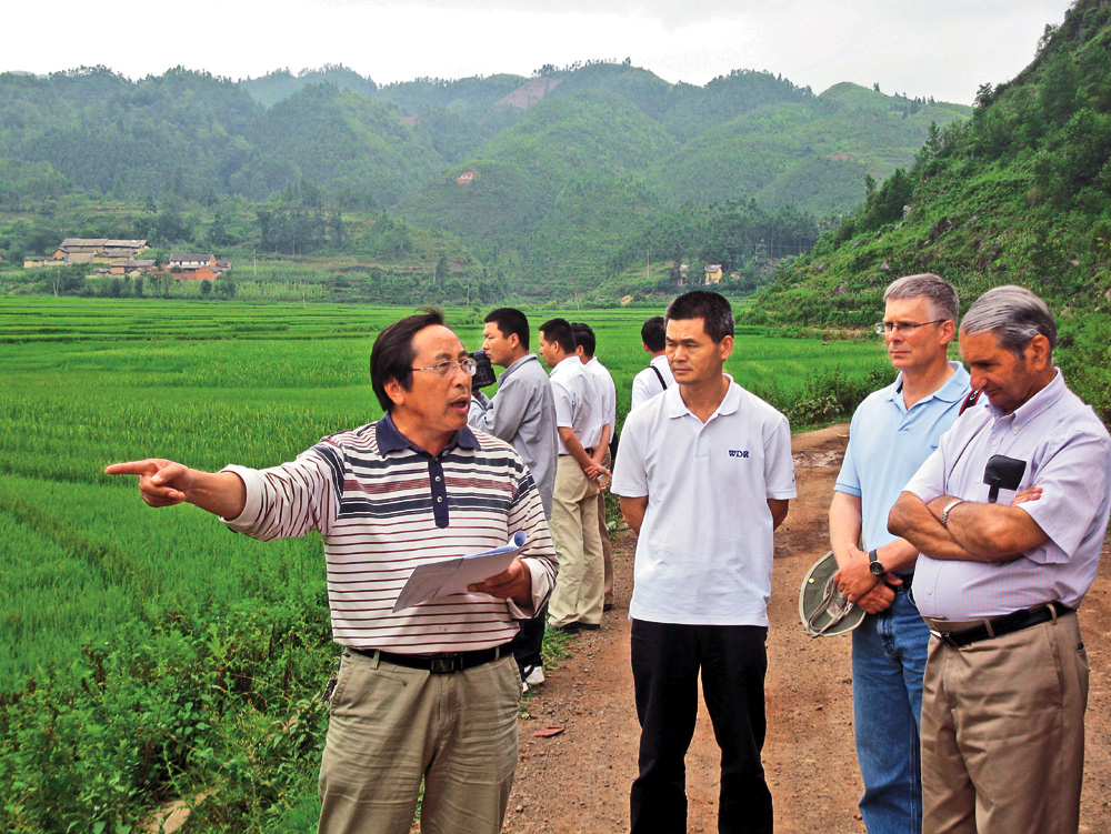 圖:雲南水稻專家李政芳(左一)在實驗田向美國科學院院士、國際水稻研究所育種部主任庫西(右一)、比爾·蓋茨基金會項目官員Brian Love博士等介紹「兩優2161」實驗情況雲南省農科院供圖