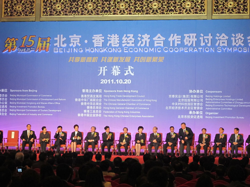為期兩天的第15屆「北京香港經濟合作研討洽談會」今天上午在京開幕。在「共享新商機,共謀新發展,共創新繁榮」的主題下,雙方將在高新技術產業、地產、交通及服務業等方面開展14場專題活動,其數量之多為歷年之最。由於本屆京港洽談會正逢中共十七屆六中全會就文化強國做出全面部署之際,文化創意產業方面的合作成為京港兩地合作的新亮點。