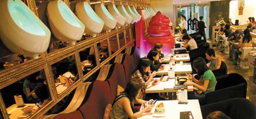 據廣州《新快報》26日報道,25日上午11時,該餐廳開門營業,大批慕名而來的客人入內用餐。在餐廳的門口,商家不僅懸掛了兩米高的沖水馬桶模型,還在門口處張貼了男女「廁所」標誌的漫畫標識。餐廳內裝飾一如洗手間,陳放了數十個馬桶、便池造型的餐桌椅,包廂以「洗手間」、「桑拿房」等風格設計。其菜譜則有「黃金便便條」、「便所大便泡芙」、「厚厚馬桶豬排飯」、「馬桶一號」、「便所歡樂拼盤」等,菜餚是盛放在「馬桶」、「洗手盆」、「大馬蹲」上供食客使用。