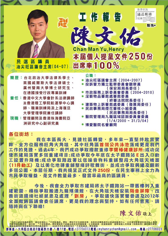 本報接到匿名投訴,指陳文佑在今年九月中區選提名開始後,通過郵政通函向選民寄發的工作報告中,標榜自己是「廣州暨南大學博士研究生」,且獲得民主黨何俊仁、張文光、涂謹申以及民協馮檢基的「全力支持」。但原來這個擁有「高學歷」的候選人,其實長期缺課、未能完成學業,根本早已被退學。