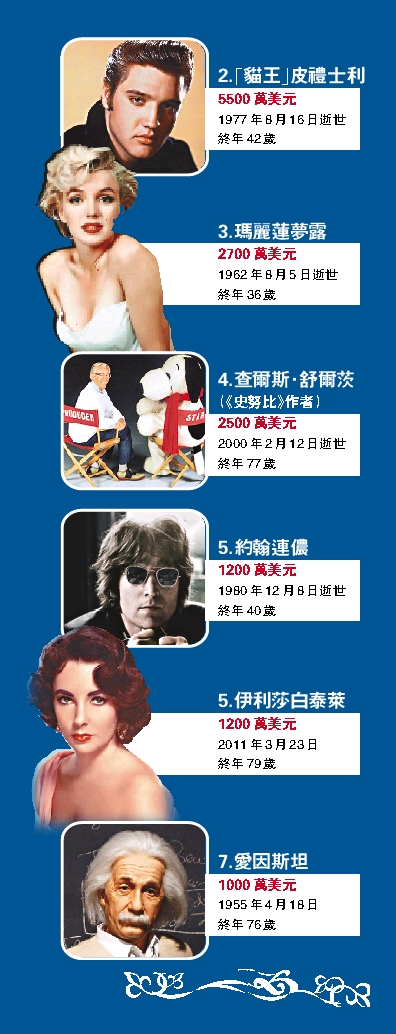 至於那些死後沒有音樂曲目可供表演的名人,他們的魅力也依然可以幫他們賺錢。今年三月份逝世的伊利沙伯泰萊,與披頭四成員約翰連儂一起列為第五位,賺1200萬美元。這些錢主要來自她暢銷的香水「白鑽石」。該香水2010年僅在美國的銷量就高達5400萬美元。