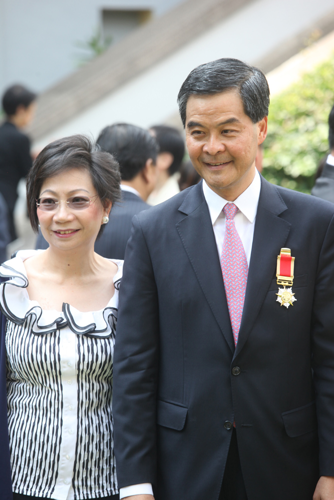 圖:梁振英昨與太太出席禮賓府授勳儀式 本報攝