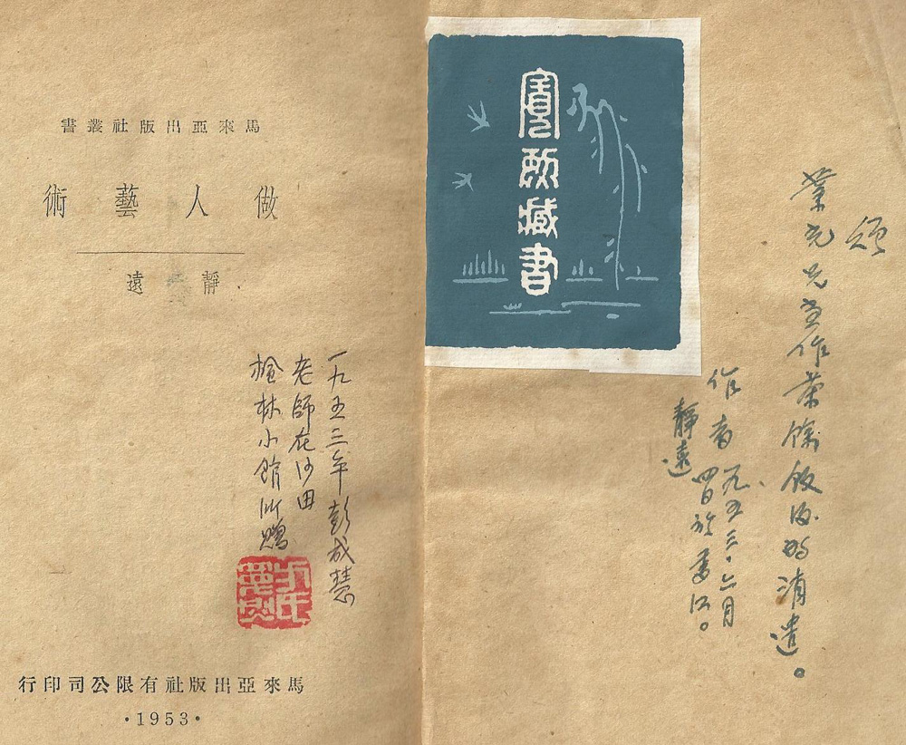 打開靜遠的《做人藝術》(馬來亞出版社有限公司,一九五三年),扉頁上有兩種題辭:右邊是作者靜遠題於一九五三年的「贈業光兄當作茶餘飯後的消遣」;左邊的是「一九五三年彭成慧老師在沙田楓林小館所贈」。