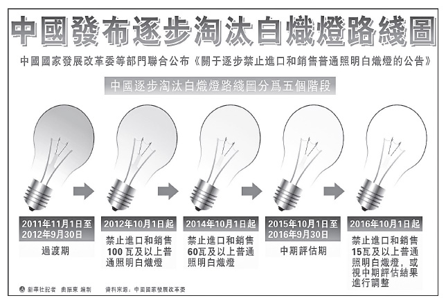圖:國家發展和改革委員會等部門公布按功率大小逐步淘汰白熾燈路線圖,並決定自明年10月1日起禁止進口和銷售100瓦以上普通照明白熾燈\新華社
