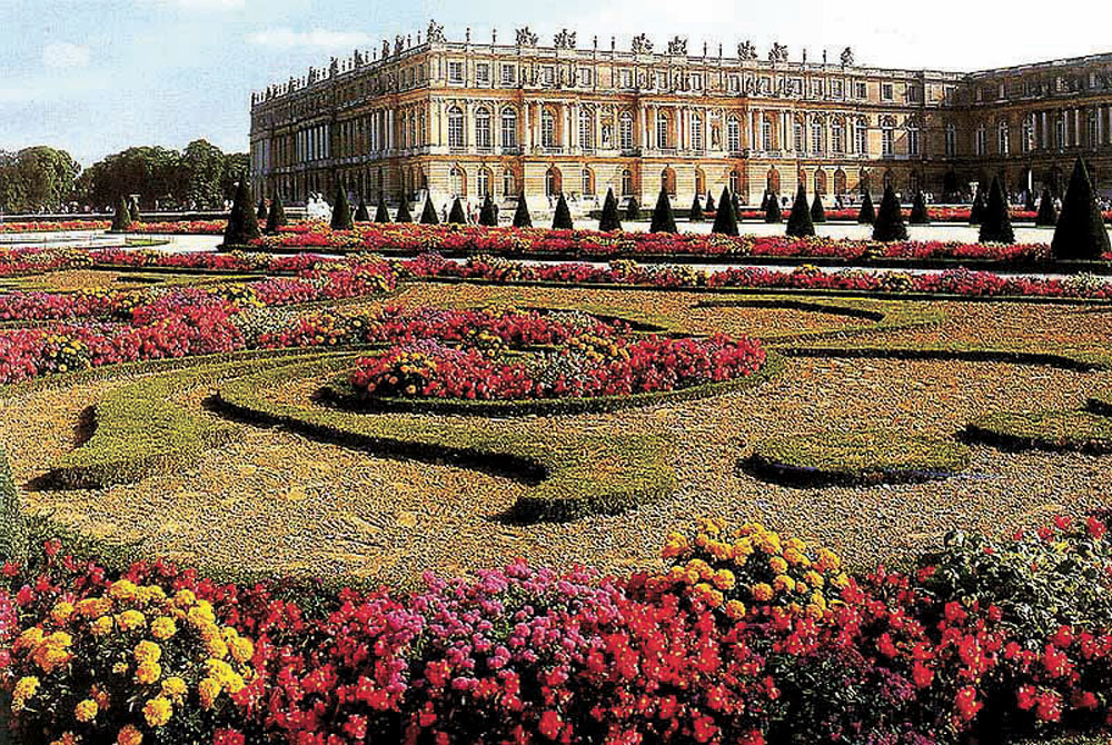 凡爾賽原是一個小小的村落。一六二四年,法國國王路易十三在這一帶的樹林中建造了一座狩獵莊。路易十三死後,他的兒子路易十四決定把它建成一座富麗堂皇的宮殿,從一六六一年動工,集中了當時最著名的設計家、園林建築師,施工人員最多時達到三萬人,直到一六八九年才完全竣工。經過兩百多年的擴展和重建,凡爾賽宮已成為一座宏偉富麗的宮殿,它佔地一百一十一萬平方米,其中宮殿建築面積十一萬平方米,園林面積一百萬平方米。廣義的凡爾賽宮分為宮殿和園林兩部分,宮殿指主要建築凡爾賽宮,園林分為花園、小林園和大林園三部分。龐大恢宏的宮苑以東西為軸,南北對稱,中軸線兩則分布着大小建築、樹林、草坪、花壇和雕塑。宮殿頂部摒棄了法國傳統的尖頂建築風格而採用了平頂形式,顯得端莊而雄渾。中軸線上建有雕像、噴泉、草坪、花壇等。宮前廣場有兩個巨型噴水池,沿池佇立着一百尊女神銅像。一條長一千六百五十米的運河引來塞納河水,六百多個噴頭同時噴水,形成遮天蓋地的水霧,在陽光下展現出壯觀美麗的七色彩虹。