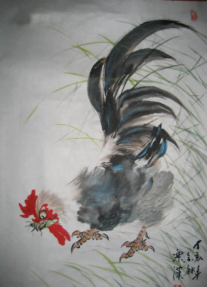 周霖一聽,喜形於色。公雞象徵着奮發向上,漢代東方溯《占有》中有「歲有八日,一日雞,二日犬,三日豕,四日羊,五日牛,六日馬,七日人,八日穀」之說,古人將一年之初的首日定為雞日,深有道理,一唱雄雞天下白嘛!因之,歷代畫雞者群星璀璨,五代的刁光胤、唐代的邊鸞、宋代的趙佶、元代的陳琳、明代的唐寅、清代的任伯年、當代的黃胄等,不勝枚舉,想在前人的基礎上有所造詣,有所創新,那非一日之功啊!雒楓深深點了點頭,他虛心請教周霖,從創意、構圖、形神、色彩,從頭學起,一絲不苟,孜孜不倦,專攻公雞。暑往寒來,年復一年,深攻不止,一攻就是50多年,半個多世紀!