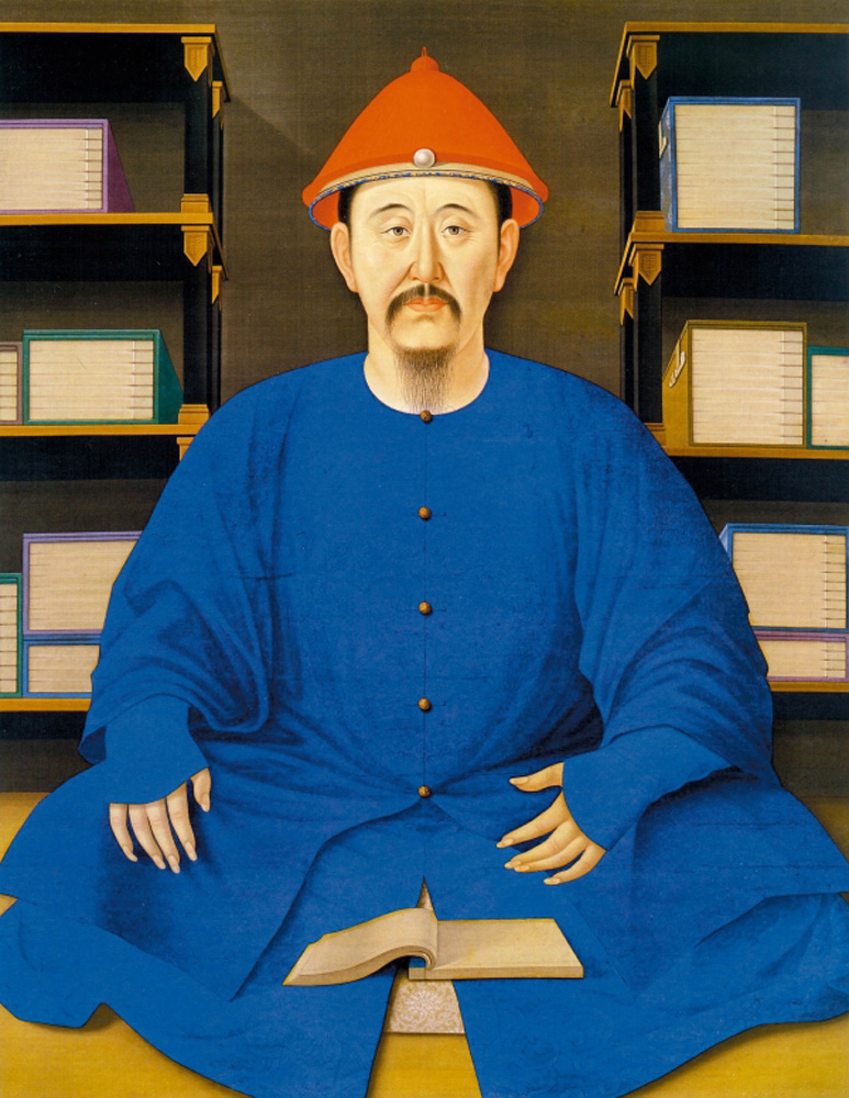 儘管連康熙皇帝御用的大閱盔甲都前來展出以添聲勢,但此次展櫃一概以湖藍為基色,乾隆的紫檀木雕漆雲龍紋寶座在湖藍色的背景展板映襯下也變得沉穩了很多。此次展覽盧浮宮選用了故宮收藏的《康熙帝朝服像》為標誌宣傳畫,遍布展廳的湖藍色也取自這幅畫上康熙身着的藍色朝服。對中國古代書畫久有研究的戴浩石對康熙的這幅畫像格外關注,在為此次展覽撰寫的以《安邦定國之畫》為標題的論文中,他將這幅雍正在其父駕崩一個月後命人繪製的中西畫風融合之作視為對「精通六術、英明睿智、心胸開放」的康熙的最佳寫照。