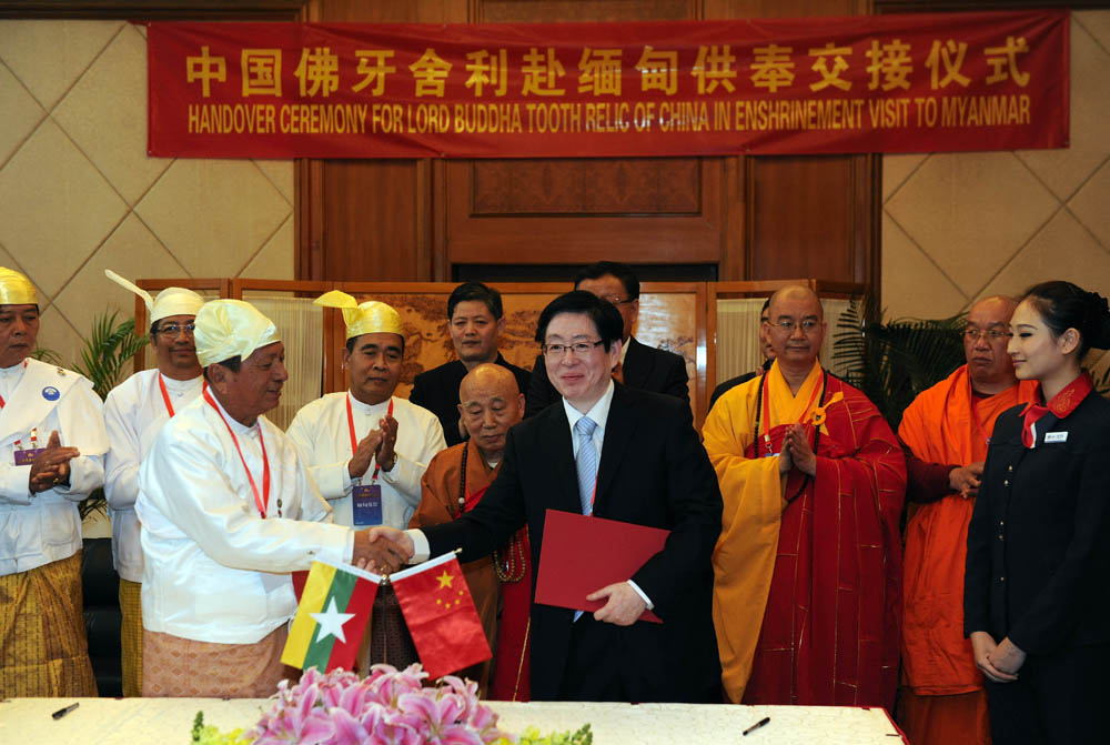 圖:中國國家宗教事務局局長王作安、緬甸宗教部杜拉吳敏貌部長分別代表兩國政府在交接協議上簽字,標誌着佛牙舍利正式移交緬方,開始在緬甸48天的巡禮供奉\中新社