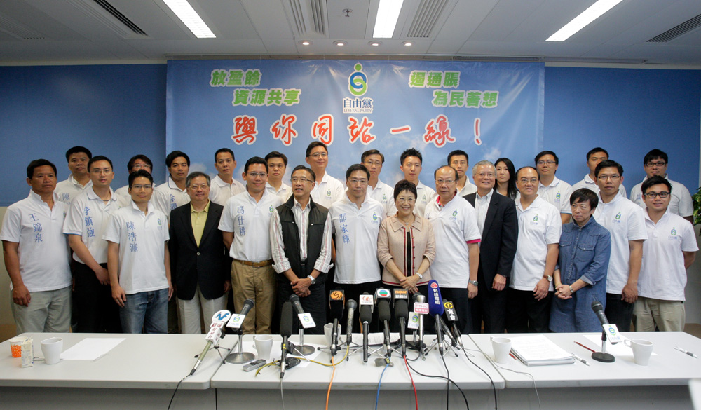 圖:自由黨的一眾高層聯同二十多名候選人昨日會見傳媒,總結今屆區選的成績\本報攝