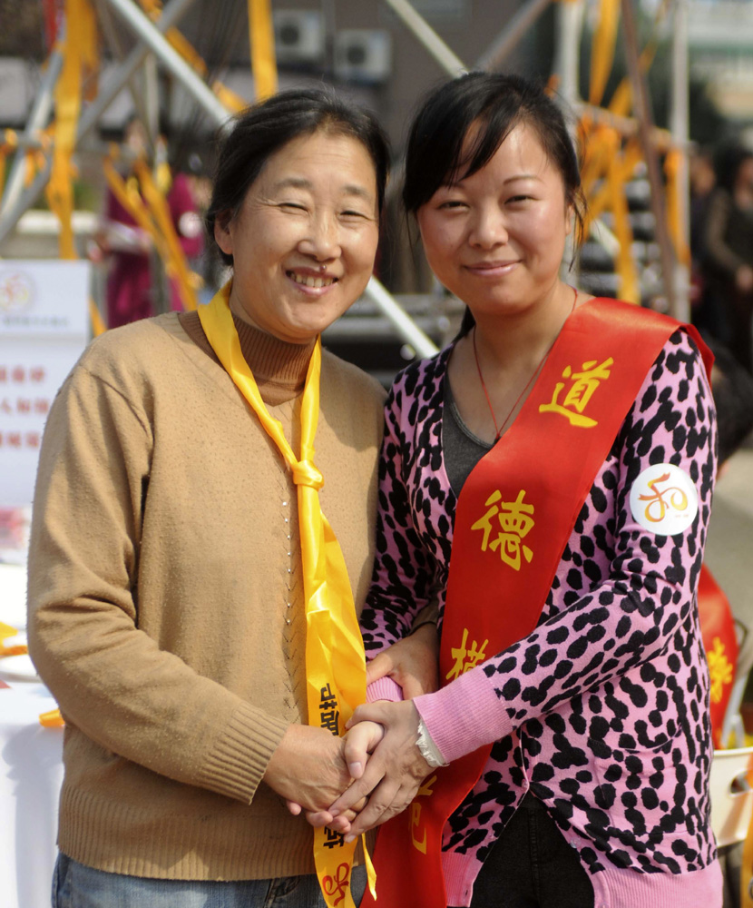 圖:杭州市第八屆「鄰居節」日前開幕。圖為一名市民與當選形象大使的「最美媽媽」吳菊萍(右)合照\新華社