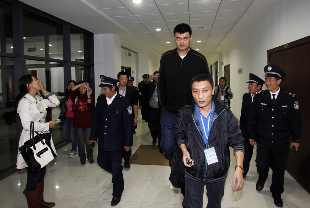 圖:姚明7日正式踏入上海交通大學,開始了他的學生生涯。首天入學的姚明引來無數同學的關注,其巨星的風采傾倒眾女生\中新社