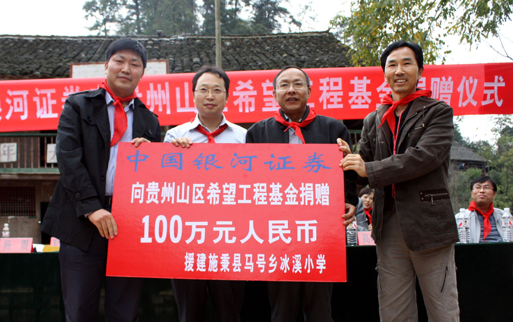 【本報記者勞莉貴陽十日電】近日,中投公司直管企業──中國銀河證券股份有限公司捐資100萬元助力貴州山區希望工程基金,援建施秉縣馬號鄉冰溪銀河希望小學。這所希望小學是貴州山區希望工程基金啟動以來援建的貴州首所全套配置教學樓、宿舍、食堂、圖書室、運動場、遠程電教室的希望小學,將讓243名學生受益,使農村孩子能夠享受城市孩子一樣的教育環境。
