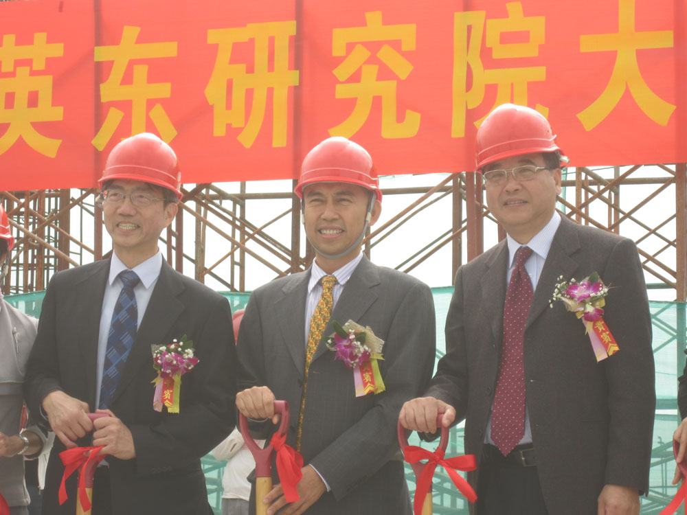 圖:科大副校長李行偉(左)、黃玉山(右)和南沙資訊科技園有限公司董事霍顯強(中)日前為科大南沙霍英東研究大樓封頂\資料圖片