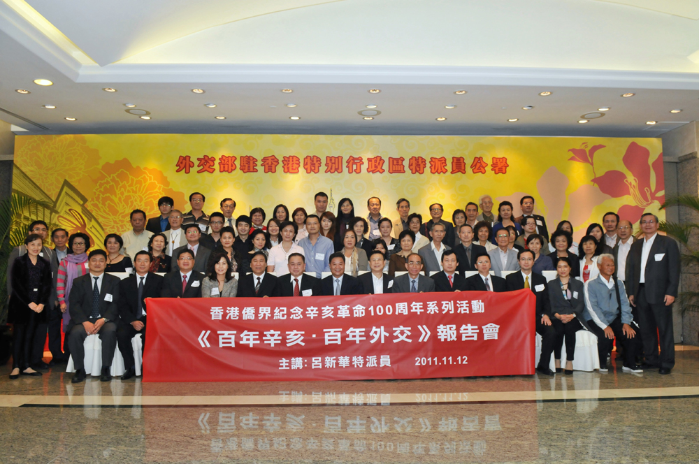 【本報訊】11月12日,外交部駐港特派員公署與香港僑界社團聯會青年委員會和會員發展及聯絡委員會聯合主辦《百年辛亥 百年外交》報告會。演講會在外交部駐港公署大樓舉行,由特派員呂新華主講,副特派員李元明主持。港僑聯會主席陳有慶、會長余國春,副會長梁淦基、李潤基以及其他首長、青年委員、屬會會員、僑友、青年近180人出席了演講會。