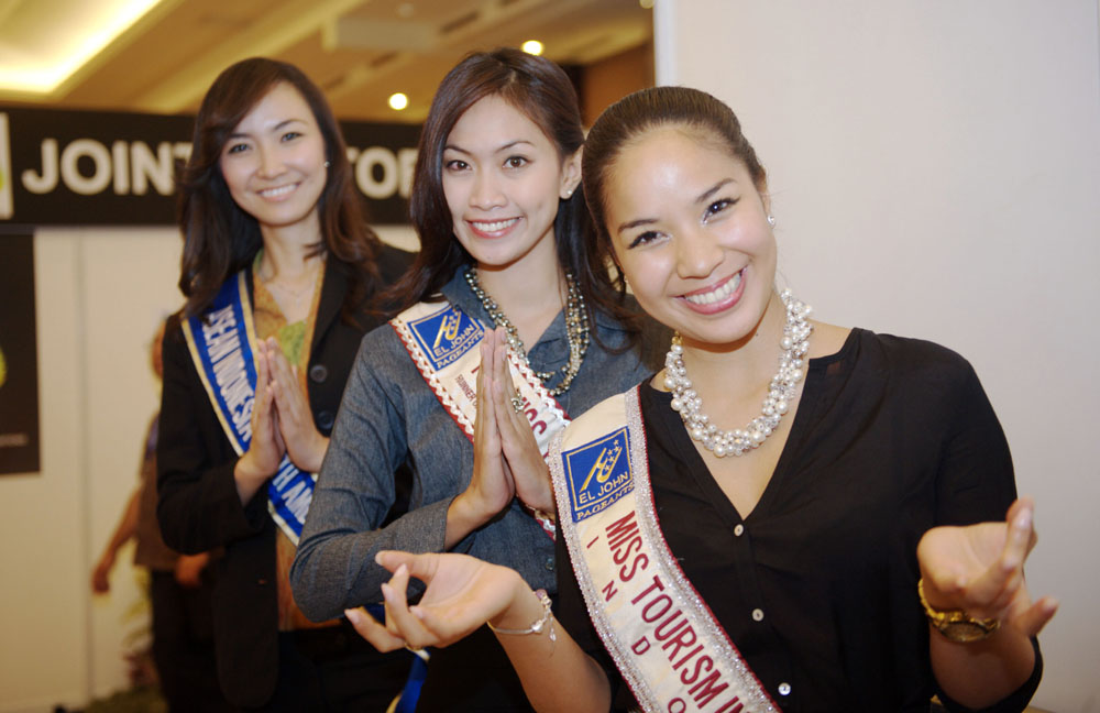 圖:在峇里島努沙杜阿會議中心外,三名曾獲印尼旅遊小姐稱號的峰會服務人員合影新華社
