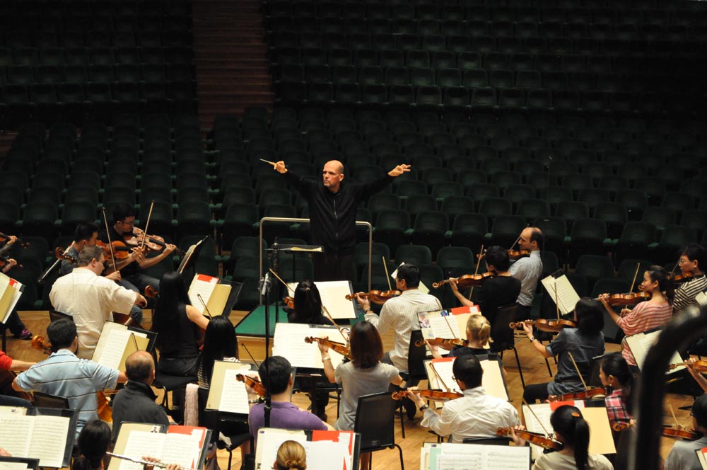 上周五,他和香港管弦樂團眾樂手為當晚的音樂會做最後排練,曲目是布拉姆斯《第四交響曲》。站在指揮台上的他一身黑色休閒裝,微駝背,很少笑。聽到長笛吹出的聲音不美,他要求樂手將那幾小節旋律多次重複;見到單簧管在某個段落有些懈怠,他立時停下,對樂手說「要盡全力,不然乾脆不要吹」;小提琴撥弦撥不出他想要的聲音,他甚至放下指揮棒,雙手虛比出個拉琴的樣子,邊示範邊說「一定要有向上的動作,讓聲音揚起來」……