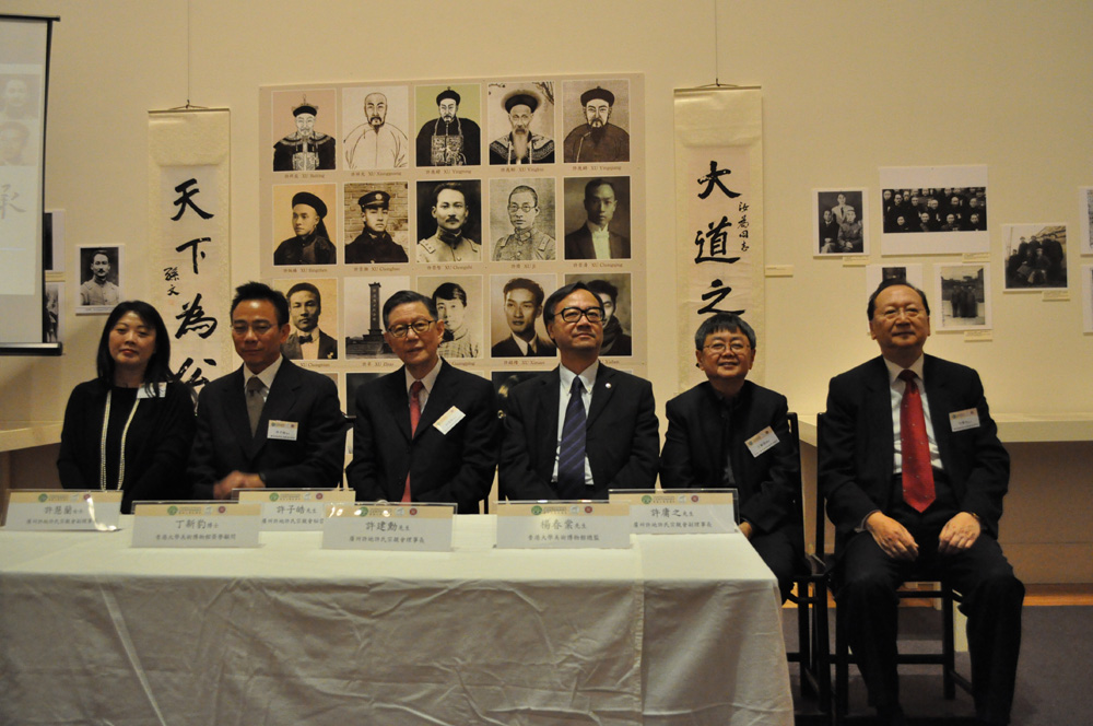 圖:許氏家族後人許庸之(右一)、許建勳(左三)、許子皓(左二)和許慧蘭(左一)與丁新豹(右二)和香港大學美術博物館總監楊春棠出席記者會\本報攝