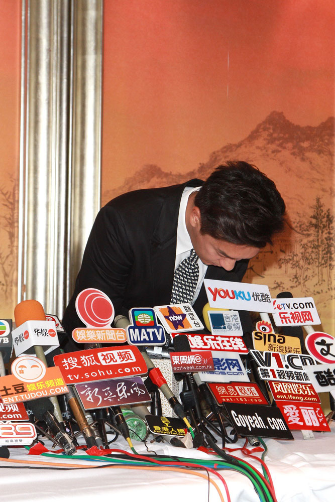 陳浩民昨日以一身黑色西裝,由腹大便便的太太蔣麗莎、經理人林查理陪同下到觀塘召開記者會,吸引半百傳媒到場。約下午四時三人步出,浩民先安排太太坐好後,便低頭緊握太太的手,當要正式發言時,他卻突然從口袋中拿出「貓紙」放在枱上,就連離開時亦因入「戲」太深而忘記「貓紙」,結果被記者發現當中內容幾乎一模一樣,就連那個時間要站立鞠躬亦有提示,不禁讓人懷疑道歉的誠意有多大。