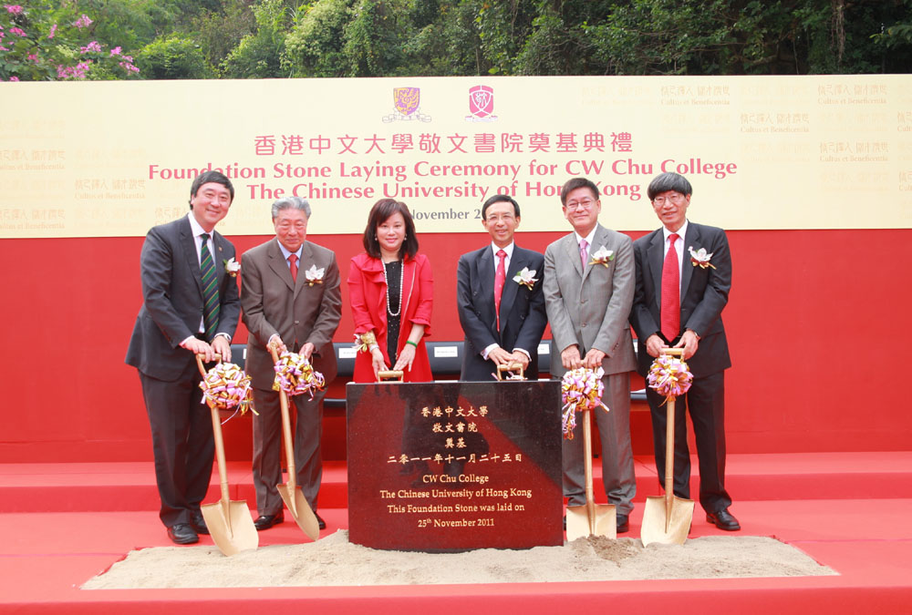 圖:(左起)沈祖堯、朱恩餘、何陳婉珍、鄭海泉、葉克勇,以及楊綱凱,為中大敬文書院奠基