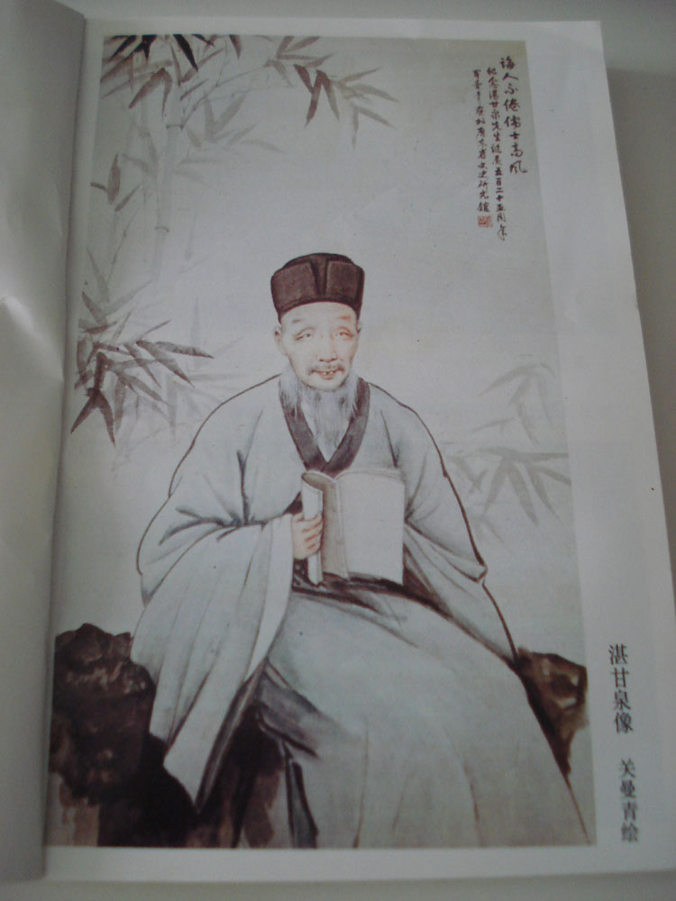 陳白沙創江門學派,其學說上接南宋陸九淵,下開明代王陽明,在有明一代理學中具承先啟後之功。湛若水號「甘泉」,雖中舉人,卻在禮部會試中落榜,隨即焚毁部檄(准考證),不再追逐功名,返粵拜陳白沙為師。在師門學習6年,盡得白沙心學精髓,終獲白沙傳授衣缽,成為江門學派的傳人。