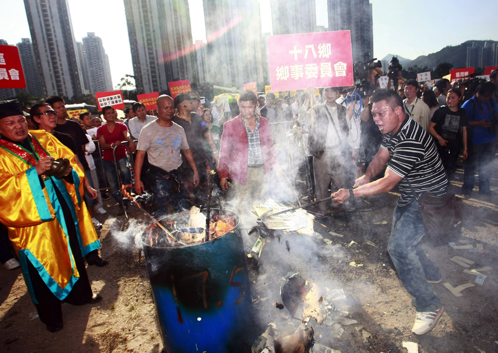 圖:近千名新界鄉民焚燒發展局派發的海報及小冊子,抗議當局清拆僭建物