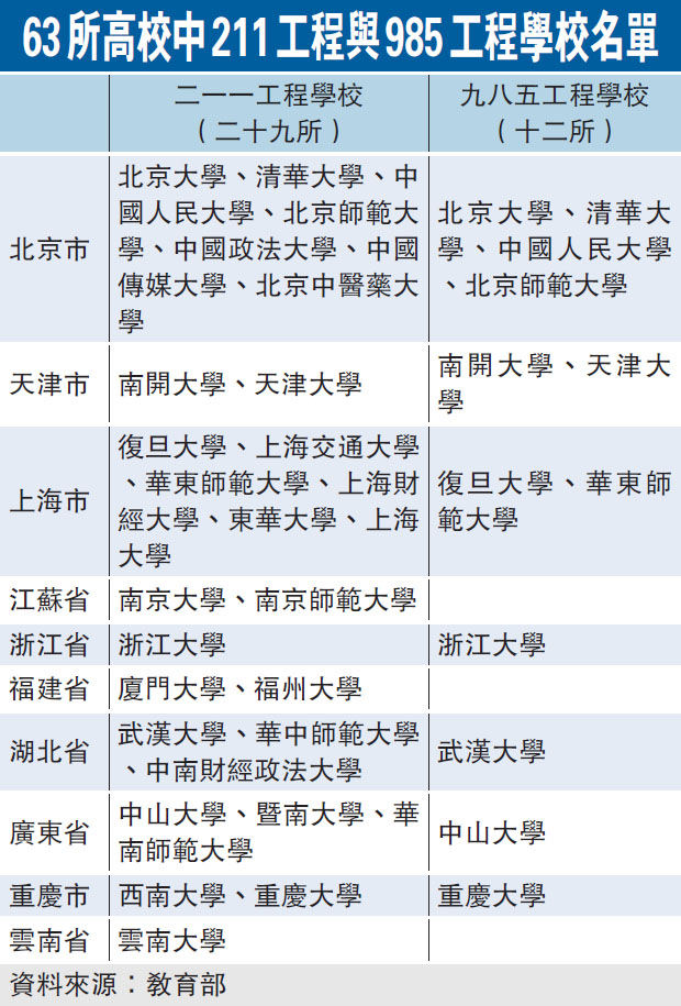 六十三所內地高校,除了人們最熟悉的北大、清華、復旦等名校,還有眾多廣受重視的大學,包括納入211工程、985工程或者兩者兼而有之的學府。全國千多所大學,有一百一十二所大學位列211工程,這次免試招港生的六十三校就佔了近三十所。全國有三十九所大學躋身985工程,來自六十三校的佔去十二所。