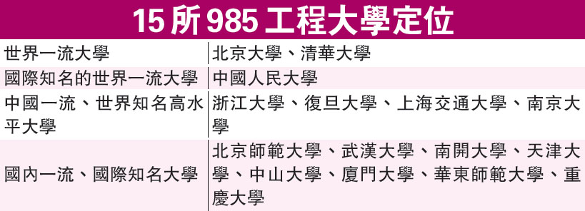 「985工程」即「創建世界一流大學」計劃,「985工程」學校產生大批具有國家標誌的科研成果,承擔大批國家重大科研項目,如國家重點實驗室第一委託單位的50%都是「985」高校(2009年數字),有些學校發表的SCI文章居世界前列。內地六十三所免試招收港生的高校中,有十五所納入「985」工程,本報昨天漏了南京大學、廈門大學和華東師範大學。(詳見附表)