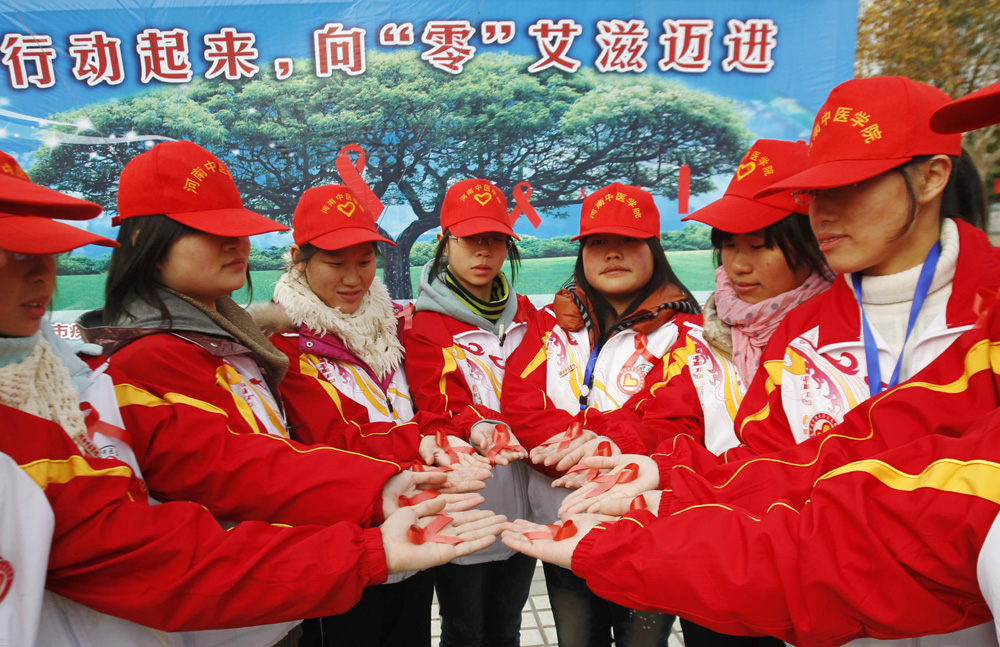 圖:十二月一日,河南高校的女大學生手捧紅絲帶組成「心」型進行防愛滋宣傳 /中新社