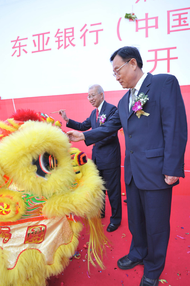 圖:東莞常務副市長冷曉明(右)與東亞中國副董事長陳棋昌在開業典禮上為獅子點睛