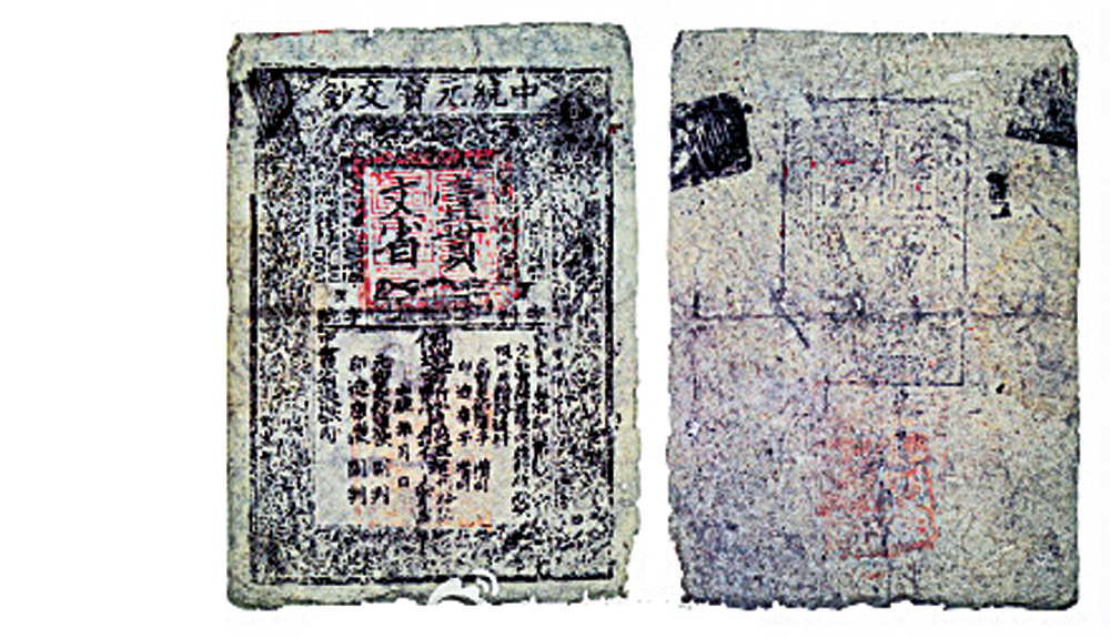 這是中國現存的最早由官方正式印刷發行的紙幣實物—元「中統元寶交鈔」,長26.4厘米、寬21.1厘米。自元中統元年(1260年)發行後,一直行用至元末