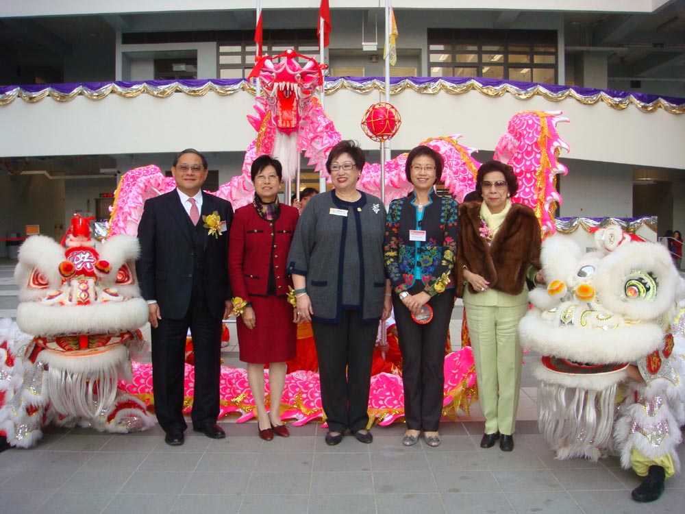 圖:馮國經(左起)、曾太、龐太、葉太、蕭太在醒獅前留影