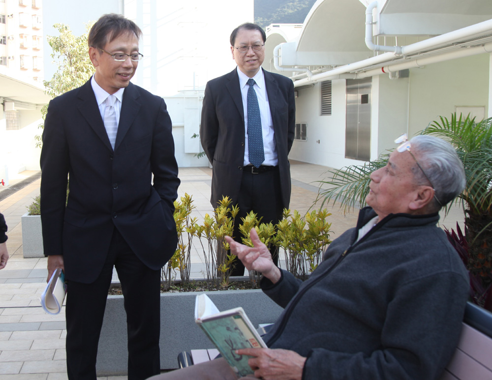 圖:黃傑龍(左)昨日帶傳媒參觀復修後的觀龍樓天台,並與住戶(右)交談。旁為房協物業管理總監葉錦誠/本報記者蔡文豪攝