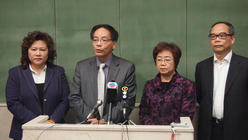圖:(左起)葵青葵盛東選區參選人賴芬芳、民建聯黨團召集人葉國謙、屯門寶田選區參選人陳秀雲及民建聯副主席劉江華,在昨日與譚志源會面後會見傳媒/本報記者鄧湄攝