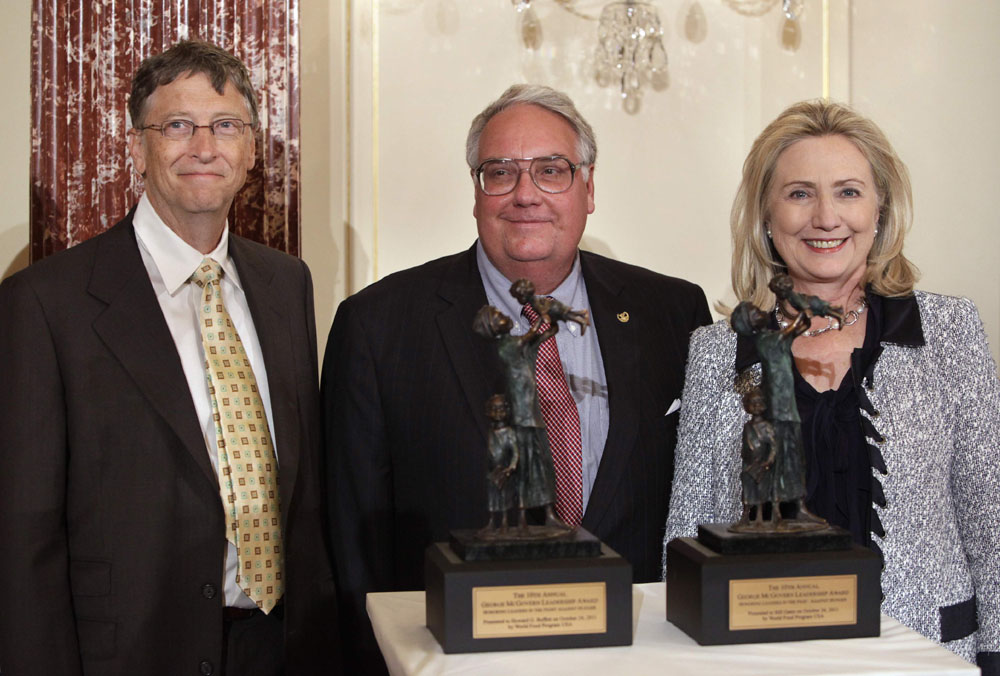 圖:巴菲特之子霍華德(中)與微軟董事長比爾·蓋茨(左)以及美國國務卿希拉里(右)合影\路透社