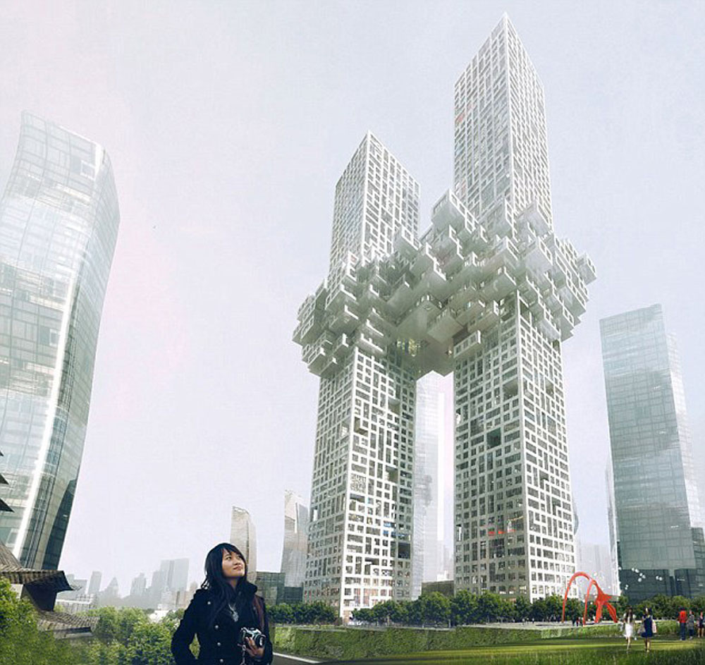 這些照片顯示了這家荷蘭建築公司MVRDV是如何設計出這兩幢由一個所謂的「像用雲層」連接的住宅樓。兩幢樓高分別為260米和300米。