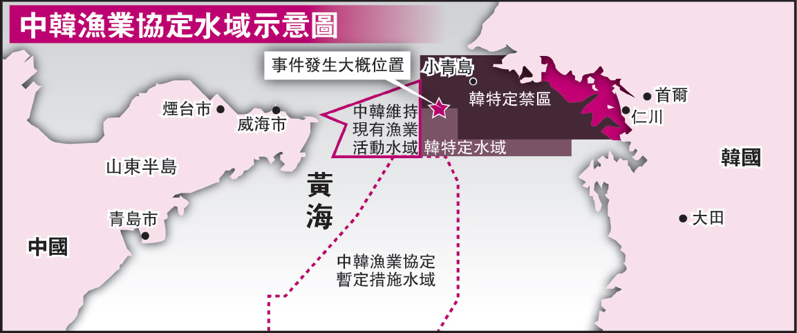 韓國沒有提供這次事件發生地的經緯度,假如確實是在仁川市甕津郡小青島西南85公里海上發生,那麼根據2001年簽署的《中韓捕魚協定》,那事發地點要麼落在「中韓維持現有漁業水域」,要麼落在「韓特定水域」,按規定,前者是「維持現有漁業活動,不將本國有關漁業的法律、法規適用於締約另一方的國民及漁船」,韓國方面管不了。而對於「韓特定水域」,則規定中國漁民禁止到韓國宣布的「特定禁區」和「特定水域」作業。2005年漁政局《涉韓漁業水域作業須知》重申了此點,而2008年《國務院辦公廳關於加強漁業安全生產工作的通知》,再次確認「禁止漁船違規進入敏感爭議水域作業」。 (互聯網)