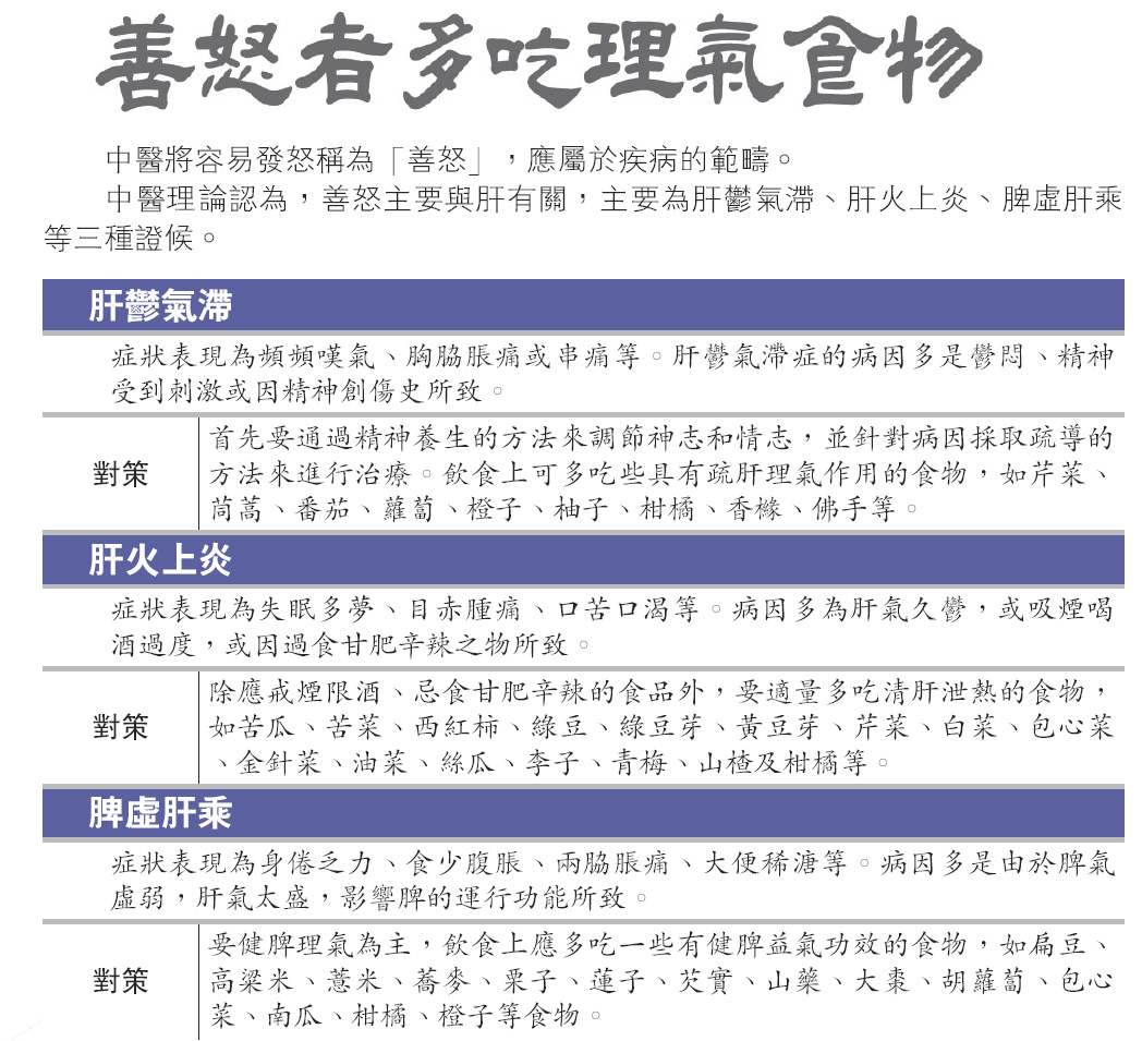 人難免都會情緒波動生氣發火。中醫認為,「肝在志為怒」,發怒與肝的調節失當密切相關。很多愛發脾氣的人是肝火過旺引起的。火性炎上,正如水是往低處流一樣,火是往上跑一樣,火氣會沿着肝經直達頭面,大怒會使氣上衝,火推氣勢,氣助火威,所以,在發怒時,許多人會感覺到一股血氣往上湧,這也是為什麼許多人在怒氣沖天時會出現臉紅頸粗的現象了。