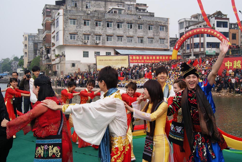 圖:17日,中國和越南兩國青年在中越界河北侖河上搭台對歌,以歌傳情,共同祝願兩國人民友誼長存。作為正在越南芒街市舉行的2011中越(芒街─東興)國際商貿·旅遊博覽會的重要內容之一,中越青年界河聯歡活動迄今已舉辦了10屆\中新社