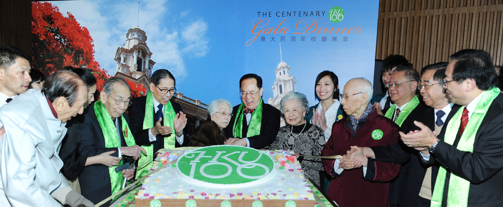 港大昨晚在香港會議展覽中心舉行慶祝百周年晚宴,獲不少城中名人到場支持,包括:特首兼港大校監曾蔭權、國學大師饒宗頤、全國人大常委范徐麗泰、基本法委員會副主任梁愛詩、前財政司司長梁錦松、前金管局總裁任志剛、前首席大法官楊鐵樑、愛國商人何鴻燊,另外還有港大副校監李國寶及三位港大前任校長黃麗松、王賡武和鄭耀宗。此外,本港教資會資助的其餘七所大學,以及北大、清華、倫敦大學國王學院等學府的校長均應邀出席。值得一提的是,港大第二屆畢業生,現年一百零一歲的人瑞校友李秀文也出席了晚宴。