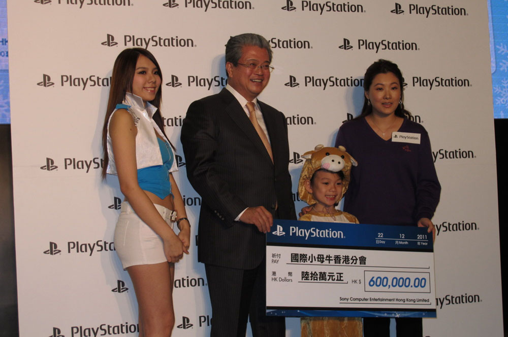 伏明霞昨以「小母牛愛心大使」身份到會展出席支票捐贈儀式。事緣今年「亞洲遊戲展2011」的最大參展商Sony推出Play Station聖誕愛心包共一百套,並捐出全數款項共六十萬元予國際小母牛香港分會。小伏昨在一位穿着牛牛裝的小朋友陪同下上台接受支票,並透露這筆款項將用來幫助四川的貧困戶,讓他們可以自給自足。