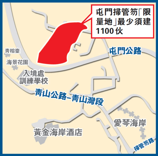 據賣地章程顯示,屯門掃管笏青山公路第48區地皮,位於前掃管笏軍營以北,背靠大欖郊野公園,地盤享海景,規模龐大,佔地約72.28萬方呎,總樓面約93.96萬方呎,地積比率約1.3倍,限制最少興建1100個單位,地盤部分位置設有70至85米的建築物高限(主水平基準以上,下同),地皮昨日起招標,明年2月3日截標。