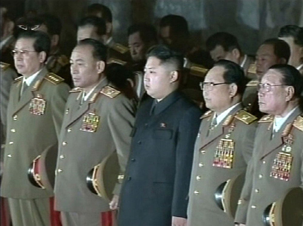 圖:12月24日,金正恩姑父張成澤(左一)與金正恩(中)一同出席弔唁儀式時,身穿軍裝,佩戴着大將肩章\路透社