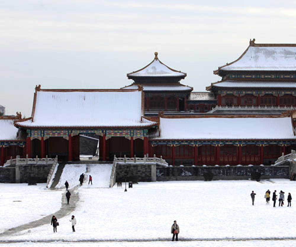 第二天去看了故宮的雪景,進了午門這座氣勢雄偉的城門,雪厚厚地落在黃色的琉璃瓦屋頂上,似乎聽見幾百年前在風雪中「廷杖」有過失大臣的慘叫。在漫天的雪中,巍然矗立的太和殿就出現在眼前,雪落在金碧輝煌的琉璃瓦上,落在太和殿前精雕細琢的漢白玉欄杆上。雪在開闊的太和殿廣場上,遊人在雪中踩出一條細細的路徑,幾個興高采烈的孩子有意不沿着踩出來的路徑,在廣場上的雪地上快樂地奔跑,留下天真燦爛的笑容和雪地上的腳印。然而,幾百年前,同樣在這樣一個地方,瀰漫着漫天的飛雪,宮闈密帳間燭光搖曳,或許在演繹着一個個爾虞我詐、刀光劍影的故事,多少陰謀淹沒在飛舞的雪花裡。後宮的御花園裡,雪落在那些珍稀花木,御池假山上,落在那些亭榭樓閣上,漫天雪花中,曾經有多少宮女穿梭其中,又有多少嬪妃紅顏薄命香銷玉殞。