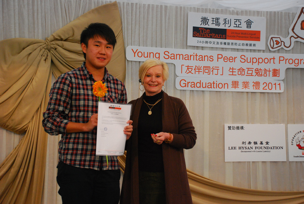 圖:撒瑪利亞防止自殺會總監Liz Chamberlain(右)向學生大使頒發結業證書\實習記者\戴羽仟攝