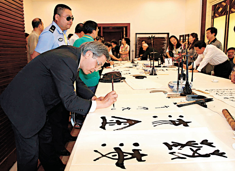 圖:單周堯(左)在畫會上聚精會神地揮毫/楊文全攝