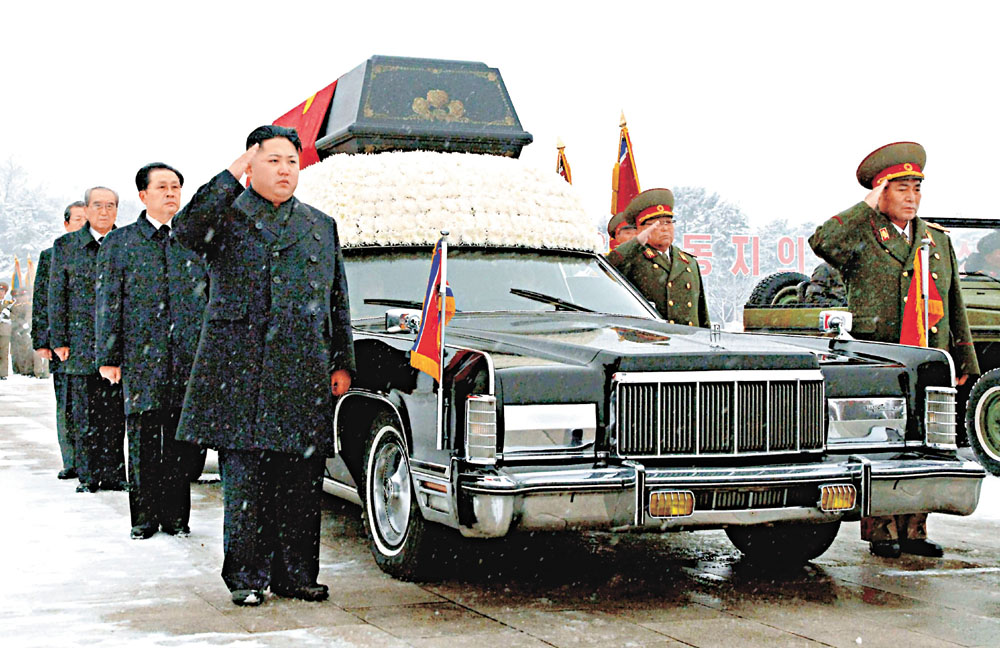 圖:靈車左方依次為朝鮮勞動黨中央軍事委員會副委員長金正恩、國防委員會副委員長張成澤、勞動黨中央委員會書記金基南、勞動黨中央委員會書記崔泰福;右方有朝鮮人民軍總參謀長李英浩、人民武力部部長金永春、人民軍總政治局第一副局長金正閣等/路透社╱朝中社