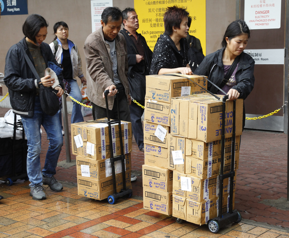 圖:水貨客拖着打包好的奶粉等待「分貨」,排隊輪候過東鐵的行李磅/本報記者杜漢生攝