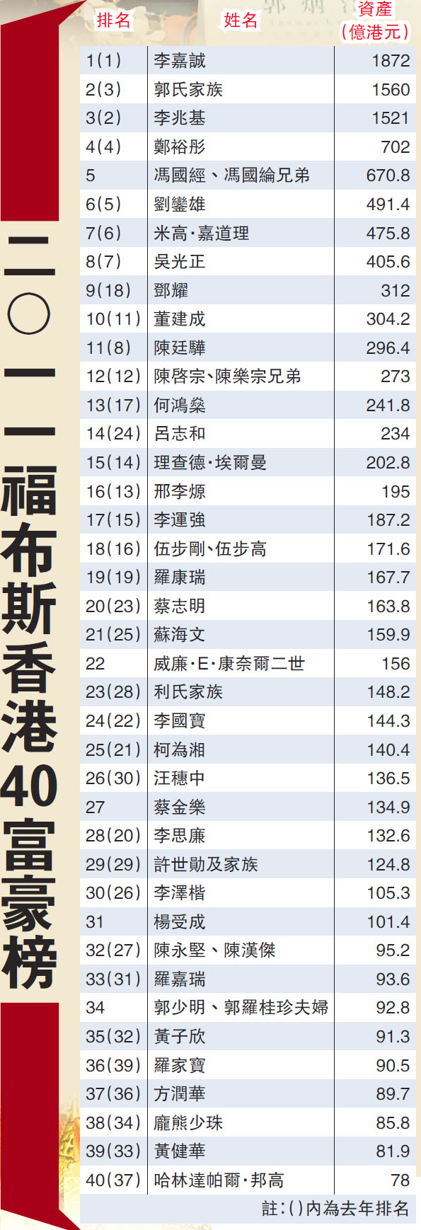 首富李嘉誠的身家有一千八百七十二億元,較去年的一千六百六十六億元,增加一成二。新鴻基郭氏家族的身家以一千五百六十億元奪得第二名,較去年大幅增加二百二十億元。恒基主席李兆基以三十九億元之差排第三位,身家有一千五百二十一億元。