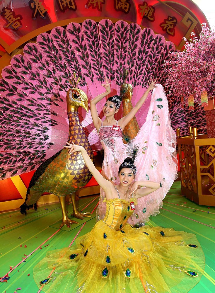 MegaBox商場在農曆新年期間準備連串精采活動及特色新年裝置,為巿民帶來花開富貴的兔年。昨日,舞蹈演員穿上飄逸紗裙,隨着美妙的音樂在機動孔雀開屏裝置前翩翩起舞,表演優雅的孔雀開屏,吸引不少顧客駐足觀賞。
